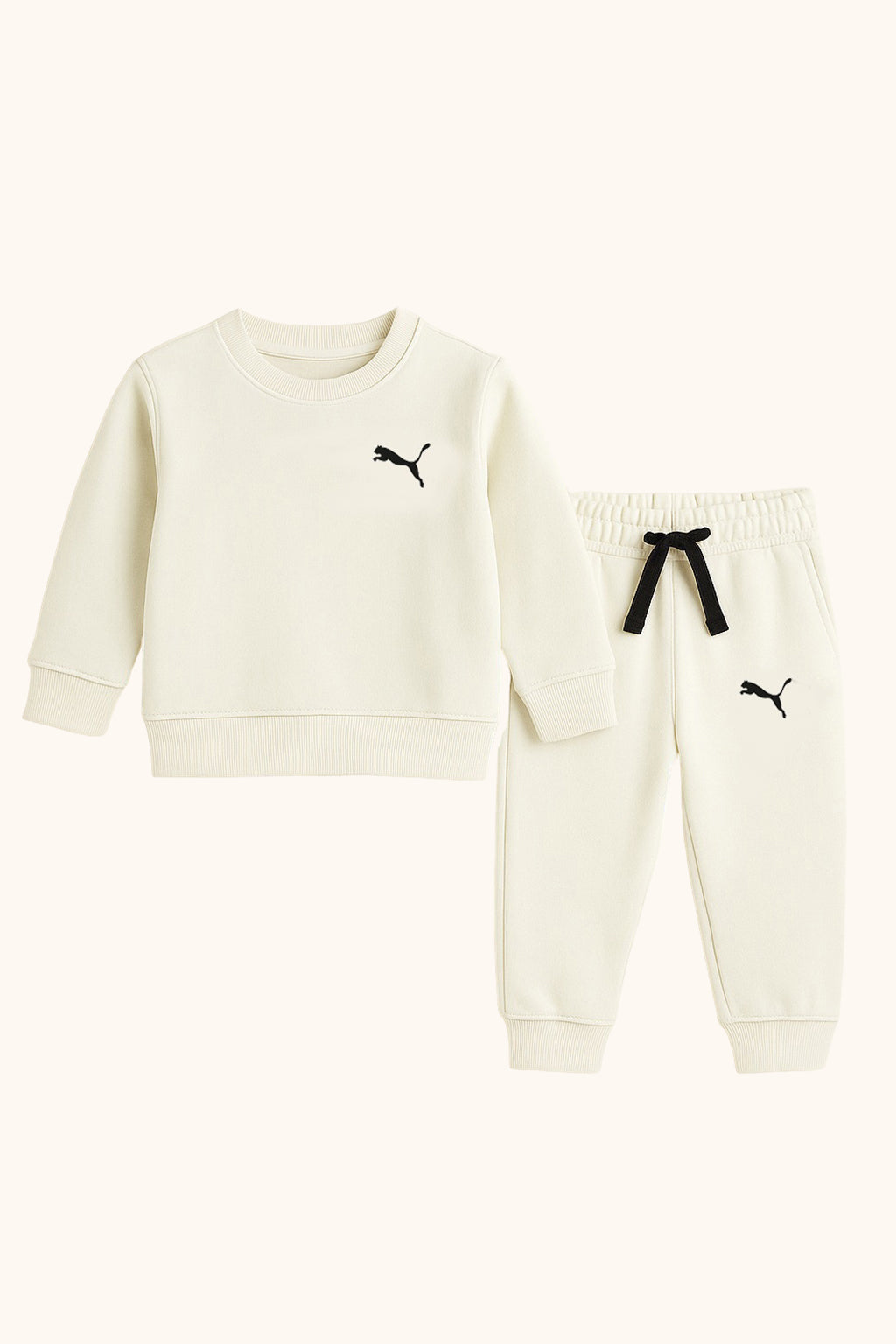 The sweatshirt features ribbed cuffs and hem for a tailored fit, while the joggers include an elastic waistband with a black adjustable drawstring for added flexibility. The black Puma logo printed on both the sweatshirt and joggers gives it a bold, authentic finishing touch — ideal for casual wear, workouts, or travel.